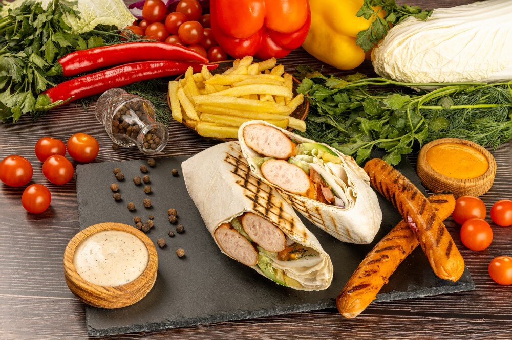 лаваш, куриные колбаски, соус горчично-медовый, картофель фри, капуста, огурцы, томаты, укроп